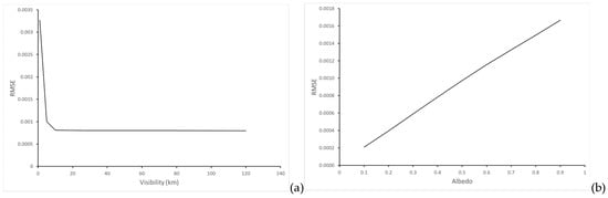 RMSE dependence on the visibility for an albedo of 0.4 (a), and on the albedo for a visibility of 30 km (b).