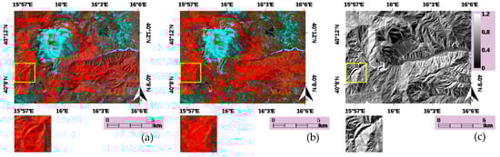 As regards to the Appennino Lucano test case, Figure 6 shows two false color reflectance images obtained by the LANDSAT-8 radiance, excluding (Figure 6a) and including (Figure 6b) the topographic correction in the correction scheme. The angle between the incoming solar radiation and the normal to the surface derived from the DEM is shown on Figure 6c. Coherently with location and acquisition time, “rural aerosol” and “mid latitude summer” were selected in MODTRAN to model the aerosols. The visibility was selected on the bases of the nearest AERONET station located in Potenza, Basilicata. The figure clearly illustrates the flattening of the scene after the topographic correction and the loss of dependence from the slopes. This effect is particularly evident in the zoomed area (yellow square of Figure 6c).
