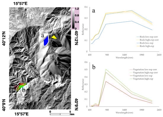 To quantify the impact of topographic correction, two homogeneous areas corresponding to rock and vegetation classes were identified. For each class, two ROIs (Region Of Interest) characterized by different sun expositions were outlined. Figure 7 shows, besides the location of the ROIs, the mean spectra of the ROIs organized into two graphs corresponding to the rock (Figure 7a) and vegetation (Figure 7b) classes. The solid line represents the spectrum before the topographic correction, the dashed line represents the same spectrum after the application of the topographic correction.