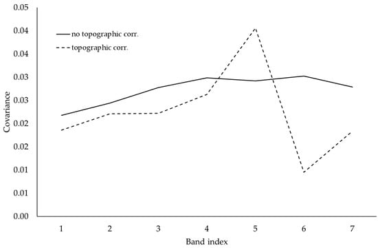 To estimate the whole improvement of the image, the correlation between the reflectance image and the sun exposition angle was computed before and after the inclusion of topographic correction []. Figure 8 shows the decrease of the correlation with the slopes after the topographic correction for all bands except for band 5, corresponding to the near infrared range (851–879 nm). This can be partially explained by the high sensitivity of the vegetation classes in this interval, which could be the expression of a physiological dependence of the vegetation classes on solar exposure.