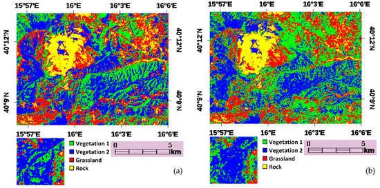 The first test case was located within the “Appennino Lucano National Park”, a protected mountainous area of the Basilicata region, Italy (Figure 3), characterized by a considerable heterogeneity of soil covers. Thanks to this characteristic, the test case was exploited to evaluate the potential of the method in relation to remote sensing applications, using two cloudless subsets (centered at 40° 10’ 0″N, 16° 0′ 0″E and 40° 17′ 0″N, 15° 57′ 0″E) of a LANDASAT-8 image acquired on 2015/08/13 at 9:34 UTC available on the USGS (United States Geological Survey) Earthexplorer website, and a 5 m spatial resolution DEM issued by the cartographic institute of Basilicata.