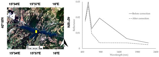 Before moving on the next test case, it is worth remarking the effectiveness of the method to the correction of environmental effects and the potential of processing data with a single and consistent model. On Figure 10, another subset of the same LANDSAT image depicts the Pertusillo Lake, a small inland water body that is surrounded by flourishing vegetation in the period in which the data were acquired. In the same figure, the graph shows the mean spectrum of a ROI (yellow rectangular) corresponding to deep water in the center of the lake before (solid line) adjacency and topographic corrections and after (dashed line) the comprehensive correction.