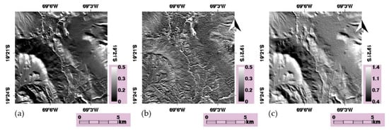 The arid climate of the Andes region determines the almost total absence of vegetation classes and allowed us to suppose that no appreciable coverage changes had occurred between the winter and summer images. Therefore, if a good topographic correction is applied, the similarity between the two images is expected to increase after the correction due to the homogenization of the terrain illumination. The similarity was estimated by means of an nsd image obtained by applying pixel per pixel Equation (23) to the winter and summer images. The nsd image was calculated before and after topographic correction.