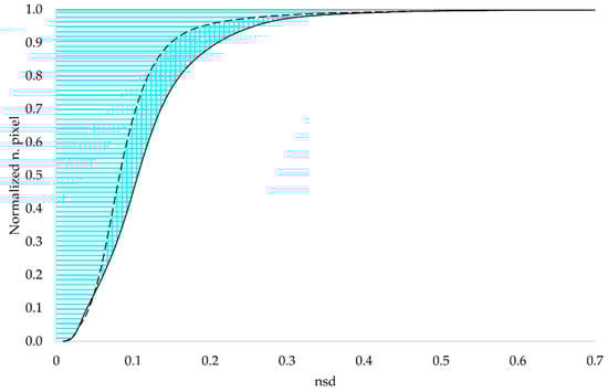 To quantify the increase in similarity, the cumulative function, which represents the fraction of pixels (ordinated in Figure 12) lower than a certain nsd value (abscissa in Figure 12), was computed both for the nsd image before topographic correction (solid line in Figure 12) and for the nsd image after topographic correction (dashed line in Figure 12). The graph depicted in Figure 12 shows the clear increment of the similarity between the winter and summer images after topographic correction, with over 85% of pixels within a distance of nsd = 0.15, compared to 75% when topographic corrections were not applied. A global measure of the improvement could be obtained by calculating the ratio between the area within the two curves (squared area in Figure 12) and the area above the blue curve (banded and squared areas in Figure 12), showing a reduction of over 15% of the difference between the winter and the summer image after topographic correction.