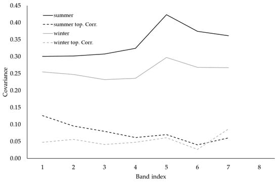 Finally, the correlation between the reflectance images and the sun exposition [] shows a very clear decrease for all bands both for the winter image and for the summer images after topographic correction, remarking the effectiveness of the correction procedure (Figure 13).