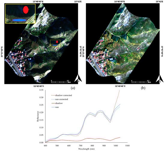 RGB (R: 653 nm, G: 546 nm, B: 439 nm) images before (a) and after (b) the application of topographic correction related to a subsets of the Reggio Calabria CASI image, corresponding to a mountain context. The zoomed area in (a) highlights the ROIs relates to shadow (red) and exposed (blue) areas. On the graph the mean spectra of the two ROIs, before (solid lines) and after (dashed lines) the application of topographic corrections are shown.