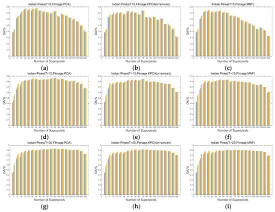 Figure 3, Figure 4, and Figure 5 show the influence of the number of superpixels on the overall classification accuracy (OA/%) of the proposed SuperKPCA method when the datasets are Indian Pines, Pavia University, and Salinas, respectively, where the number of superpixels is selected from . For each figure, the number of training samples is 5, 10, 20, and 30 from the first to the last row, and the blue, orange, gray, and red bars represent the OA when the reduced dimensions are 5, 10, 20, and 30, respectively. “FImage: PCA” indicates that the fundamental image used for segmentation is the first PC obtained by PCA. “FImage: KPCA (σ = smvar)” indicates that the fundamental image for segmentation is the first PC obtained by KPCA, and the parameter σ of the RBF kernel is determined by the formula when acquiring the first PC. Correspondingly, “FImage:KPCA(σ = 1)” indicates that the parameter σ of the RBF kernel is equal to 1 when acquiring the first PC. “FImage: MNF” indicates that the fundamental image used for segmentation is the first PC obtained by MNF. Note that when dimensionality reduction is performed after the segmentation is completed, the values of σ are all determined by the formula in all experiments in this study.