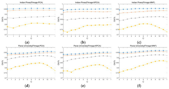 (1) When no superpixel segmentation is performed, KPCA does not perform as well as PCA in all three datasets in most cases; however, when the first PC of PCA is used as the fundamental image, the performance of KPCA (P-SKPCA) is generally better than that of PCA (SPCA) when based on a single segmentation scale. For the Indian Pines, Pavia University, and Salinas datasets, the classification accuracy obtained by P-SKPCA can be increased by 0.06%–0.74%, 2.64%–4.23%, and 0.10%–0.41%, respectively, when compared with SPCA. This increase again proves that after using superpixel segmentation, KPCA can make better use of the nonlinear features that are widely present in hyperspectral images, thus showing better performance than PCA, and this advantage is most evident in the Pavia University dataset. This is mainly due to the fact that the texture features of the Pavia University dataset are more complex than the other two datasets. Therefore, the results obtained by nonlinear dimensionality reduction are more discriminating than those obtained by linear dimensionality reduction. When based on multiscale segmentation and using the first PC of PCA as the fundamental image, KPCA (P-MSKPCA) also outperforms PCA (MSPCA) in more cases.
