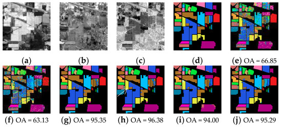 In our work, the SVM algorithm adopting a spectral Gaussian kernel is implemented with the help of the library for SVMs (LIBSVM) [49]. For the SVM classifier, there are two key parameters that need to be set: the error penalty parameter C and the kernel parameter gamma. Similar to the code disclosed in a previous study [33], the value of C is set to 100,000, and the value of gamma is selected within the given set . Instead of using cross validation to select the optimal value of C, this study randomly selects the appropriate number of samples from the ground-truth data for training, uses the remaining samples for testing, and then records the highest classification accuracy obtained from the candidate gamma values in the given set to simplify the calculation. All experiments are repeated ten times with a different training set to minimize the difference in classification accuracy caused by different training samples, and the average classification accuracy is recorded.