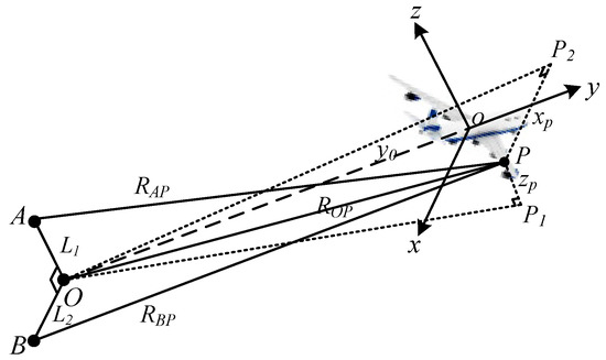 The configuration of the InISAR system is demonstrated in Figure 1. Antenna O acts as both the transmitter and receiver, while antennas A and B operate in the receiving mode only. L1 and L2 denote the lengths of the baselines OA and OB, respectively. A target coordinate system xoz is built referencing the right-angle layout of the three antennas. is an arbitrary scattering center located on the target whose projections on planes xoy and yoz are P1 and P2, respectively. denotes the initial distance from antenna O to the reference center o, and , , and denote the initial distances from P to three antennas, respectively. Suppose the transmitting linear frequency modulated (LFM) signal from antenna O is