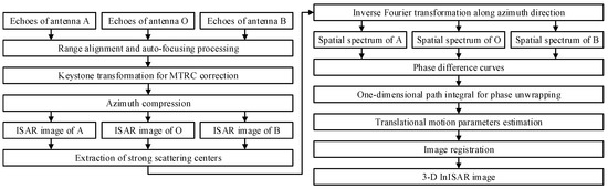 The derivation of the value of is omitted here, as it can be directly obtained from the range scale in the ISAR images. To summarize the above analysis, a block scheme of the InISAR imaging procedure based on the SSCF technique is presented in Figure 2.