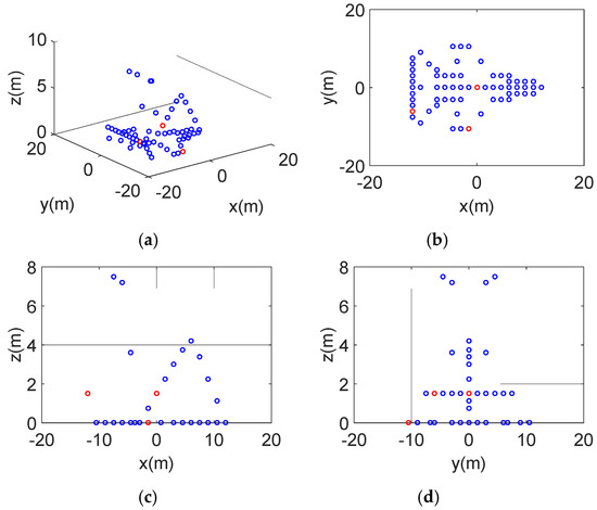 In order to verify the effectiveness of the proposed SSCF technique, an InISAR imaging simulation of a moving airplane model is presented. The parameters in the simulation are shown in Table 1. The airplane model contained 64 scattering centers, and the size of the airplane model was 21, 24, and 7.5 m in length, width, and height, respectively. For a vivid visualization, the model was depicted in four different views from four visual angles in Figure 3, with (a), (b), (c), and (d) corresponding to the 3-D view and projections on the xoy, xoz, and yoz planes, respectively. Three SSCs were assigned at the tail, wing, and fuselage, respectively, as highlighted with red circles in Figure 3. The ratio of scattering intensity between these SSCs and the others was 3:1. As a result, several ordinary scattering centers were distributed in the same range cell with the SSCs. The target was assigned to move at a constant velocity along the x direction, which led to image misregistration between ISAR images of antenna O and antenna A.