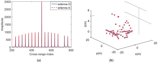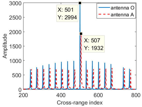 After range alignment, autofocus, and MTRC correction processing, three ISAR images were obtained. Based on the system parameters in Table 1, we calculated the Doppler shift between ISAR images of antenna A and antenna O at 5.5 cells. The range profiles of ISAR images at y = 0 of antenna A and antenna O are shown in Figure 4. It was obvious that there was a Doppler shift of six cells on the peak positions. To compare performances between the conventional method in [7] and our method, we added a pair of antennas with 0.04 m length of baseline to the conventional method because it used short baselines to achieve phase unwrapping of motion measurement curves.
