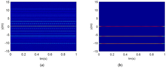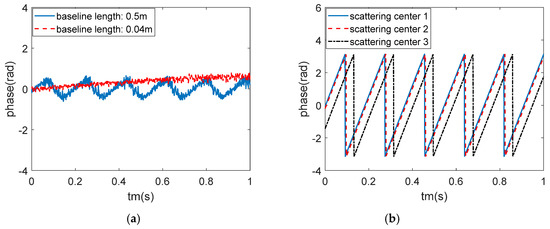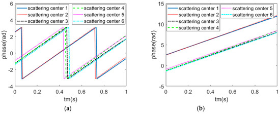 Figure 5 shows the spatial spectrums of radar echoes, and Figure 6 shows the phase difference curves of the spatial spectrums, both with (a) corresponding to the conventional method and (b) corresponding to our method. The SNR was 0 dB in this simulation. It can be seen from Figure 5a that the multiple scattering centers in a fixed range cell introduced a serious “angle glint” phenomenon. The “angle glint” phenomenon was eliminated by extracting the SSCs, as shown in Figure 5b. The influence of the multiscattering centers in motion parameter estimations is visualized in Figure 6a. Firstly, the “angle glint” phenomenon and noise introduced serious nonlinearity to the phase difference curves, which destroyed the real phase difference relationship and deteriorated the estimation precision of motion parameters. Secondly, without the short baseline, different scattering centers had different phase wrapping positions, and the one-dimensional path integral method was not applicable in this condition. In contrast, the curves in Figure 6b were linear, and the phase wrapping positions of each curve were constant. Noise was effectively filtered with the filter operation in the image domain, which ensured an excellent linearity of the motion trajectory even under a low SNR.