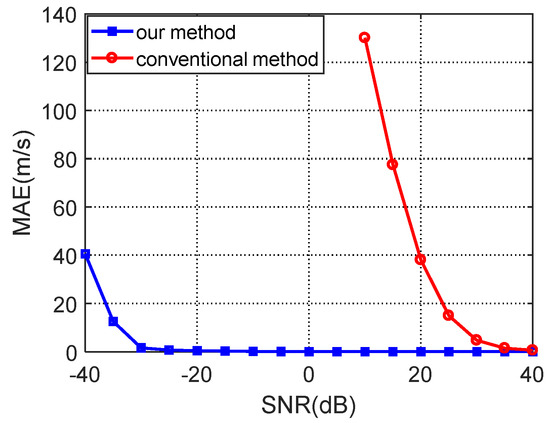 where is the ith estimated velocity, is the real velocity, and is the number of simulation times. Here, the MAE of the estimated velocity was provided based on 100 Monte Carlo simulations under different SNR environments, as shown in Figure 9. The MAE of the conventional method was larger than 6.8 m/s when the SNR was under 30 dB, which meant the antinoise performance of the conventional method was very poor. This method was only suitable for extremely high SNR environments. The MAE of our method was under 6.8 m/s when the SNR was larger than −30 dB. The low MEA in estimated velocity proved the excellent antinoise ability of the proposed SSCF technique.