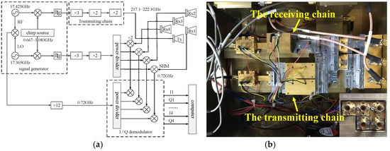 In order to further verify the effectiveness of the proposed SSCF technique, equivalent verification experiments in the laboratory environment were carried out. The schematic diagram of the THz radar system and the photograph of the front-end setup is shown in Figure 10. The five antennas were arranged in two rows, with three receiving antennas in the upper row and one transmitting antenna and one receiving antenna in the other row. R1 and R2 formed the vertical interferometric baseline, and R2 and R3 formed the horizontal interferometric baseline. Both the vertical and horizontal baseline lengths were 2.1 cm. R4 was ignored in the InISAR experiment. Besides InISAR imaging, this system also had many other potential applications such as InSAR imaging, ViSAR imaging, and micromotion target 3-D imaging. The THz radar system was based on the linear frequency modulated pulse principle. A chirped signal ranging from 217.1 to 222.1 GHz was transmitted, and the echo signals were received by the four receiving antennas.