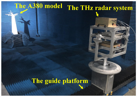 The experimental configuration is shown in Figure 11. In the experiment, the THz radar was put on a one-dimensional horizontal guide platform, and the velocity of radar was 1 m/s. The vertical distance between the radar and the target was 10 m, and the initial connection from the target to the radar platform was perpendicular to the motion direction. This was a typical SAR imaging scenario, but it was equivalent in that the radar was static, and the target moved along the horizontal direction, which matched the InISAR scenario described in this paper. To decrease the SNR of the radar echoes, the power transmitted from the radar was reduced to 10 mW. The pulse width was 163.8 μs, the pulse repetition frequency was 2500 Hz, the sampling frequency was 12.5 MHz, and the data acquisition time was 1 s. The target was an Airbus A380 model. The length, wingspan, and height of the model were 45, 52, and 17 cm, respectively.