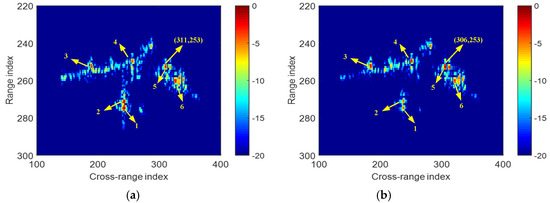 The reflected signals received by R1, R2, and R3 were used to form the InISAR images, and the reference signal was the reflected signal of a corn reflector located at the same position of the airplane model received by R2. Thus, the imaging geometry is the same as the discussed L-shaped three-antenna configuration. During the imaging process, nonlinearity of the signal frequency and the inconsistencies of the amplitudes and phases among channels were compensated together with the reference signal, and a phase gradient autofocus algorithm [36] was adopted to compensate the influence of guide platform vibration. The ISAR images of channels R2 and R3 were interpolated three times and shown in Figure 12. Taking the strong scattering center at the right wing as an example, there are five Doppler cells that deviated along the azimuth direction.