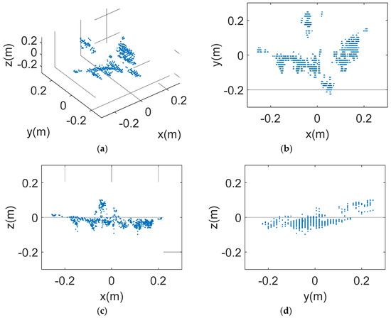 InISAR imaging results of the airplane model. (a) 3-D view; (b) xoy view projection; (c) xoz view projection; and (d) yoz view projection.