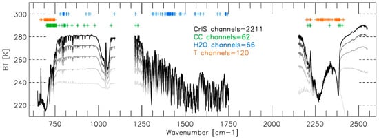 Cross-track Infrared Sounder (CrIS) brightness temperature (BT) spectra for five different atmospheric states varying in percent cloud cover from black to light grey as follows: 0%, 20%, 40%, 60% and 80%. CLIMCAPS employs a subset of channels in the retrieval of each ECV to linearize the inversion problem, maximize information content and minimize scene-dependent uncertainty. Here we show the channel subsets for the three CLIMCAPS ECVs discussed in this paper, namely, 62 channels for cloud properties (green), 66 channels for water vapor (blue) and 120 channels for temperature (orange).
