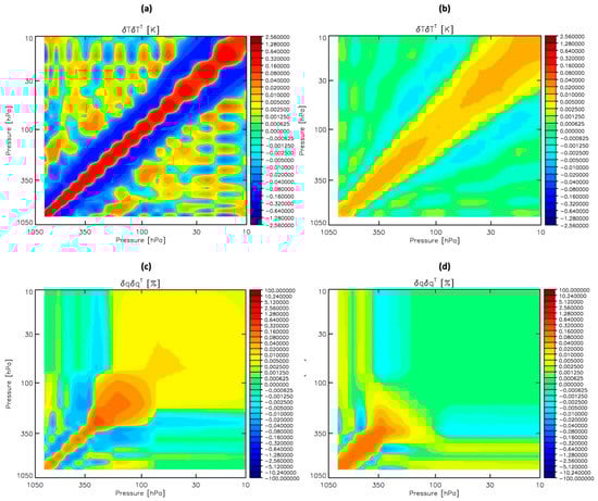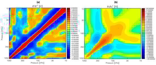 A priori error covariance matrix for (a) temperature [Kelvin] and (b) water vapor [%]. The temperature error covariance matrix, , is calculated from an ensemble of profile difference between ECMWF and Merra2, and the water vapor error covariance matrix, , is calculated in the same way except in percentage units ([ECMWF–Merra2]/ECMWF). The ensemble is made up of 233,135 profiles from four focus days to cover four seasons; 1 January 2015, 1 April 2015, 1 July 2015 and 1 October 2015.