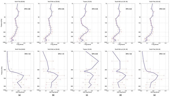 CLIMCAPS averaging kernels () for temperature (top row) and moisture (bottom row) retrievals from an ascending SNPP orbit (daytime) on 21 March 2018. CLIMCAPS generates profiles of for each retrieval individually to characterize the amount of information contributed by the measurement at each retrieval level. Here they are averaged (blue) across latitudinal zones with error bars (orange) characterizing its variance at each pressure level. The zones are (a) North Pole, (b) Northern mid-latitude, (c) Tropics, (d) Southern Mid-latitude and (e) South Pole. The zonal average degrees of freedom (DFS) is listed at the top in each figure. The error bars represent the standard deviation of values at each pressure level across the latitudinal zone.