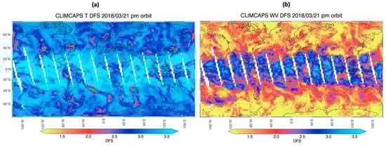 CLIMCAPS scene-dependent information content as quantified by the degrees of freedom (DFS) for (a) temperature and (b) water vapor retrievals from an ascending SNPP orbit (daytime) of CrIS measurements on 21 March 2018.