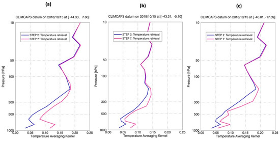 CLIMCAPS averaging kernels for temperature from three individual datums centered on the [latitude, longitude] location in the title at 01h30 on 15 October 2018. CLIMCAPS retrieves temperature twice, once after cloud clearing (blue) and a second time after the retrieval of atmospheric gases (magenta)—H2O, CO, O3, and HNO3. “Step 2” and “Step 7” refer to the steps outlined in Section 2.2.2, Figure 1. The CLIMCAPS sequential retrieval approach allows scene-dependent error propagation to stabilize inversion and maximize information content.