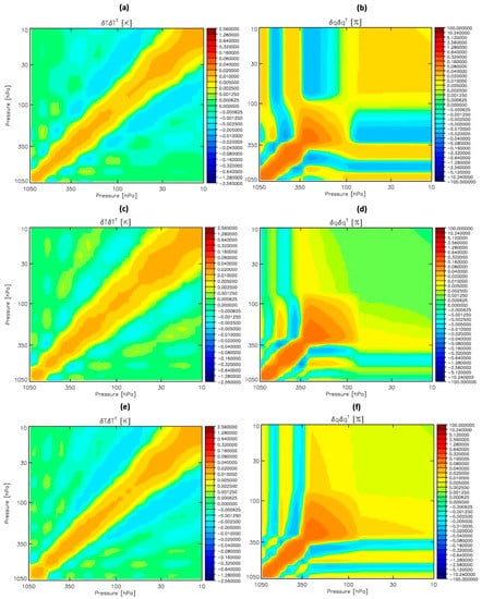 CLIMCAPS calculates and outputs an error covariance matrix, , for each retrieved ECV at every datum. Broadly speaking, is the sum of three sources of uncertainty (Section 2.2.1; Equation (3)) namely, the null space (, instrumentation as well as interference from background state variables. In CLIMCAPS we combine the latter two terms into one term since they are both spectrally based (Section 2.2.2). For temperature, the null space error covariance matrix is high (Figure 7a) and weakly correlated, whereas the magnitude of the spectral error covariance matrix is lower (Figure 7b) with stronger correlation, especially in the stratosphere. For tropospheric H2O (Figure 8c,d), the contribution from the two sources of uncertainty are similar in magnitude but correlation is introduced by uncertainty propagated from the measurements (broader orange feature in Figure 7d). All these sources of uncertainty and error contribute to the magnitude and structure of the averaging kernel of a retrieved ECV at a specific datum in time and space.