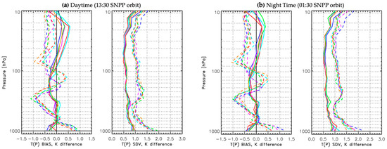 NUCAPS (dashed lines) versus CLIMCAPS (solid lines) for (a) daytime and (b) night time retrievals from SNPP/CrIS. Sensitivity to choice of a priori estimate for profiles of temperature, T(P) as quantified by the bias and standard deviation (SDV) in units Kelvin for six global days of measurements from SNPP/CrIS retrievals. ECMWF is used as estimate of the true state and space-time interpolated to SNPP/CrIS resolution. Daytime is defined as the ascending SNPP orbit with 13:30 local overpass time and nighttime is the descending SNPP orbit with 01:30 local overpass time.
