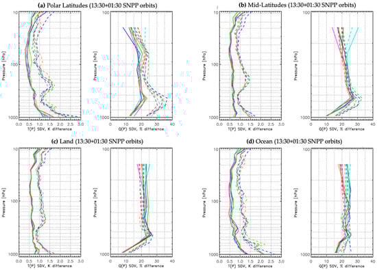 NUCAPS (dashed lines) versus CLIMCAPS (solid lines) over different geographic regions, (a) Polar latitudes (>60° north and south), (b) Mid-latitudes (between 60° and 30° north and south), (c) over land and (d) over ocean. Scene-dependent uncertainty as the standard deviation (SDV) with respect to ECMWF for retrieved temperature T(p) in units Kelvin and water vapor Q(p) as percent from six global days of SNPP/CrIS measurements.