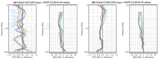 Global statistics of (a) NUCAPS from SNPP/CrIS (solid lines) and Aqua/AIRS (dashed lines) as well as (b) CLIMCAPS from SNPP/CrIS (solid lines) and Aqua/AIRS (dashed lines) as the bias with respect to ECMWF of temperature T(p) in units Kelvin and moisture Q(p) as percent profiles from six focus days.