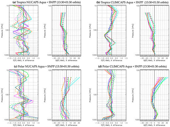 Regional statistics of (a,c) NUCAPS from SNPP/CrIS (solid lines) and Aqua/AIRS (dashed lines) as well as (b,d) CLIMCAPS from SNPP/CrIS (solid lines) and Aqua/AIRS (dashed lines) as the bias with respect to ECMWF of temperature T(p) in units Kelvin and moisture Q(p) as percent profiles from six focus days for (top row) Tropical latitudes (<30° north and south) and (bottom row) Polar latitudes (>60° north and south).