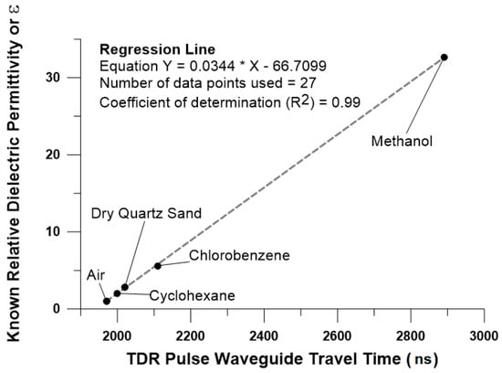 For subsurface dielectric permittivity, a Spectrum Technologies, Inc. Field Scout 300 time-domain reflectometry (TDR) instrument was used to read raw GPR pulse travel times (in units of nanoseconds) along the two 7.5-cm steel spike waveguides (probes) rather than the calibrated volumetric water content, which is typically recorded. For this survey, the raw wave guide travel times were recorded, and converted to a TDR-derived dielectric permittivity (εTDR) based on empirical laboratory calibration of the waveguide travel times (see Figure 4) using various materials with known relative dielectric permittivity at 20 °C [].