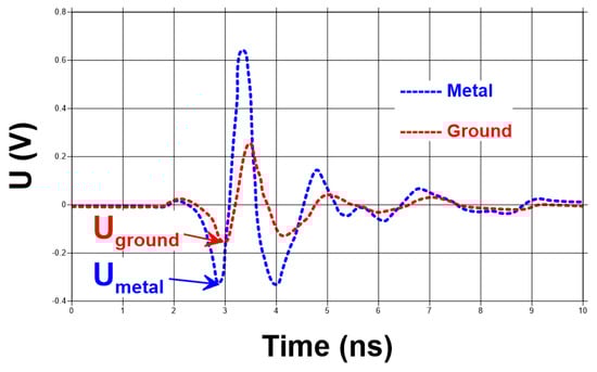where U are voltages as marked in Figure 6. The negative sign was necessitated by the polarity reversal of the transmit pulse upon reflection by the metal sheet.