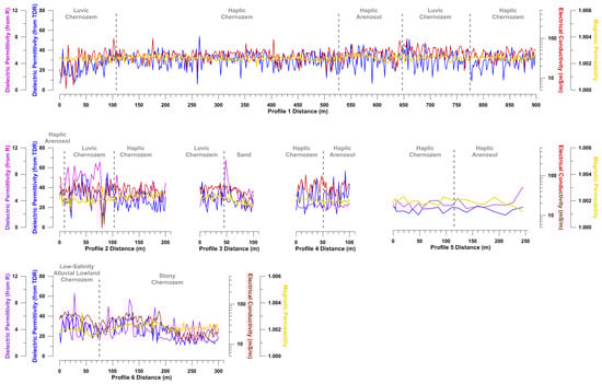 The measured and/or derived soil electromagnetic parameters recorded along the six survey transects are plotted in Figure 7. The profiles also showed the lateral contacts between soil types. All the profiles showed considerable short-scale variation in individual parameters, but the physically-independent parameters seemed to generally track each other over longer scales. We tentatively interpreted this as linkage between parameters due to, e.g., the simultaneous effects of moisture content on dielectric and conductivity, and the possible coincident effect of clay content on conductivity and magnetic permeability. Note that conductivity data were not collected along transect 5, due to a very stony surface.