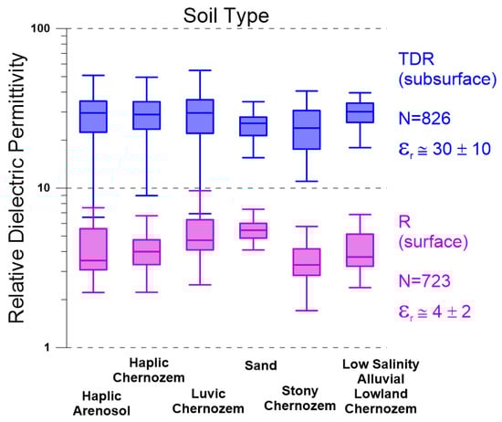 - Filonenko, V.A.; Chubinsky, N.P. Measuring the electric parameters of chernozem with various moisture contents in the frequency range 250–3500 MHz. J. Commun. Technol. Electron. 2006, 51, 685–690. [Google Scholar] [CrossRef]