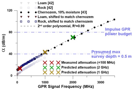 Empirical correction of measured attenuation based on published values [,] for earth materials across a range of signal frequencies.