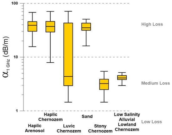 Estimated attenuation for a 1 GHz signal in different local soils types.