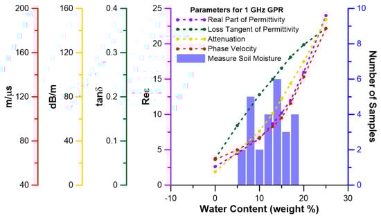During electromagnetic data collection, 26 soil samples, representing the upper 20 cm, where collected and the weight percent moisture content determined in the laboratory by oven drying. The distribution of moisture contents is depicted by the bar graph in Figure 11. The graph also shows the variation in electromagnetic properties at 1 GHz for chernozems with varying moisture content as abstracted from data in []. The effects of moisture content on many of the plotted parameters became pronounced above roughly 15% moisture, suggesting (as is commonly the case) that GPR scanning would be most effective if performed during dry seasons or periods.