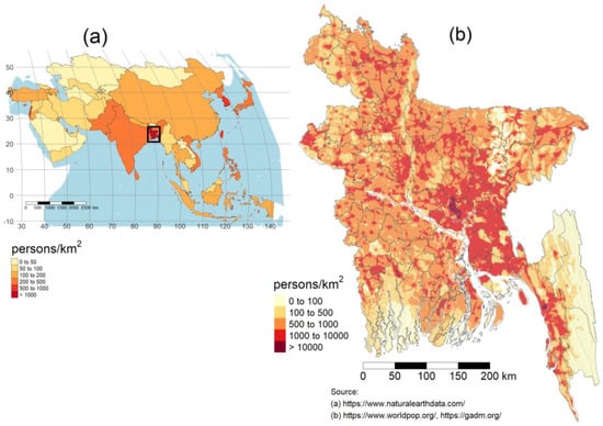 Study area map: Population density in Asia and Bangladesh. (a) Population in persons/km2 in Asian countries. (b) Population in persons/km2 in Bangladesh. Bangladesh is among the most densely populated countries in the world and as population density increases, so does the demand for food staples like rice. Boro season rice production helps meet the growing demand for food, and typically improves the efficiency of rice production with higher yields per unit of area. As arable land decreases due to urbanization and other factors, understanding where rice is grown will be increasingly important.