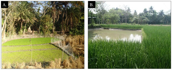 Images of rice production near Khulna, Bangladesh. (A) Rice seedling preparation for boro season (January 2016) near Khulna, Bangladesh, and (B) high-yielding variety rice during the boro season (March 2015) near Khulna, Bangladesh. Photo credit: Aaron Shew.