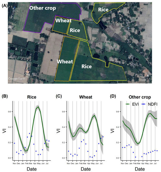 The majority of previous rice-mapping research attempted to identify pixels that show the characteristic temporal pattern of flooding followed by transplanting using remote sensing indicators such as spectral VIs [10,13,14,23]. Specifically, these VIs are the green vegetation index [26,48,49,50,51], which are sensitive to leaf chlorophyll content or plant greenness, and the water or flood index [26], which are sensitive to leaf water content and soil moisture/submersion. Notably, Boschetti et al. [26] found that enhanced vegetation index (EVI) and normalized difference flood index (NDFI) are more sensitive in their response to vegetation and water reflectance than other VIs such as normalized difference vegetation index (NDVI) and land surface water index (LSWI). So, this present study primarily focused on EVI and NDFI. Time series plots (Figure 3) are provided for EVI and NDFI indices to further demonstrate land surface phenology. The two indices are calculated based on the following formulas: