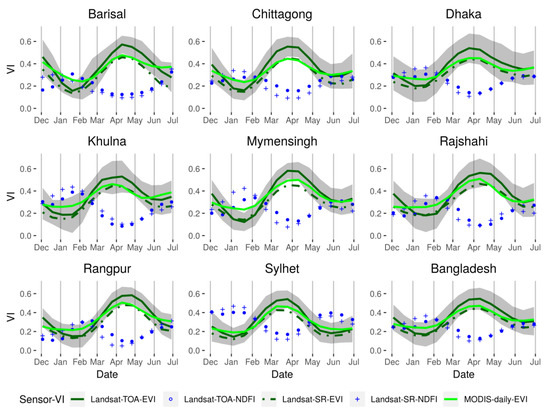 where is the spectral indices value at time t (Julian date), is number of days per year, represents an estimated intercept, is a coefficient for the overall trend in , is a coefficient for the secondary trend in t, and and are coefficients of the intra-annual change corresponding to highest possible annual cropping intensity (explained below). We used two calendar years of data (e.g., 1 January 2017 to 31 December 2018) to ensure sufficient number of clear observations that is needed to find the coefficients in Equation (3) for each growing season. In this model, we considered three frequencies per annum () to account for the three potential cropping seasons—aus, aman, and boro—that occur in a given crop-calendar year in Bangladesh. Years in the context of agricultural records are represented by two years, e.g., “2017–2018” functionally represents 1 July 2017 to 30 June 2018. This includes the aus, aman, and boro seasons for a given production year. It is important to mention that the synthetic time series may not be ideal for studies requiring absolute measurements (e.g., relating ground observations with satellite measurements); but the method used in this study relies on the detection of relative trends across time.