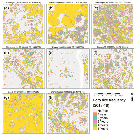 In Figure 6, eight regions are highlighted based on different rice-planting frequencies between 2014 and 2018. The maps consist of 10 km2 plots with the central coordinates and upazila names listed above. Notably, Brahmanbaria and Bogra demonstrate areas where boro rice is consistently planted year-to-year. On the other hand, dry-season rice production in Lakshmipur, Natore, and Jhenaidah is highly variable, with no consistent pattern for how many years of rice were planted from 2014–2018. Some of this pattern can be explained by the wheat blast outbreak in 2016 affecting at least eight districts in northwest Bangladesh [62]. Following the event, all farmers in those districts were advised against planting wheat in the following year(s) [63]. Based on the spatiotemporal patterns of boro rice area that emerged from our analysis, we believe many of the farmers planted rice in the dry season instead of wheat. Sunamgonj and Chittagong are divergent, showing substantial areas where boro rice was consistently produced alongside many pixels that seem more marginal and less frequently identified as rice-producing. Khulna illustrates the coastal region where boro rice is much scarcer. This provides a closer multiyear of boro rice production stability at the regional level compared to the map presented in Figure 4 above, and it further illustrates the adaptability of the HTS-VIs model.