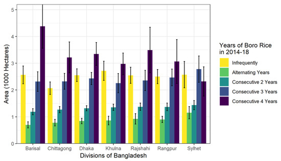 To further extend the HTS-VIs results, the temporal patterns of boro rice production were also analyzed for consecutiveness based on results shown in Figure 7. Pixels not identified as rice for all five years were merely considered unstable above, but here the temporal consecutiveness of rice planting is summarized for each of the eight Bangladeshi Divisions. We introduced the following common temporal categories: “Infrequent,” “alternating,” “two,” “three,” and “four,” and summarized for the total area and standard errors for districts in each division. Infrequent represents the number of district pixels within the division that had one year of boro rice or more than one non-boro rice years in between two boro rice production. Alternating represents the pattern for a one year break between boro rice production. Two, three, and four embody any scenario where the pixel had consecutive boro rice for that number of years, with the larger number of consecutive years counting only once. Of these signatures for consecutive years, four was the most common rice-candidate pixel signature for consecutiveness in all divisions except for Sylhet, where boro rice production was seemingly more infrequent. Notably, “five” was omitted as it is represented by the stable rice pixels in Figure 4, and five was the most common rice pixel category with greater than 250,000 pixels in each of the eight divisions.