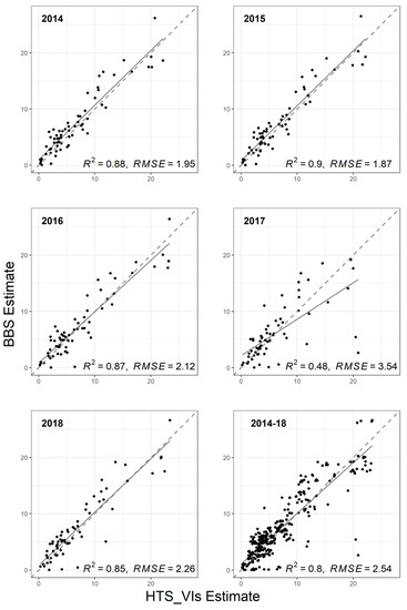 District-wise results of the HTS-VIs model follow similar regional patterns to those estimated in BBS. Estimates from the HTS-VIs implementation and the BBS estimates are in close agreement, approximately 80% of the time, across all production years between 2013–2014 and 2017–2018, as demonstrated by the scatterplots and trend lines in Figure 8. The R-squared across all years is significantly affected by the low correlation between the BBS and HTS-VIs estimates during 2017 (R2 = 0.48). All other years (2014–2016, 2018) were between 85 and 90% correlated with an average R2 = 0.88. This may be explained by the fact that BBS reports harvested areas only, whereas the HTS-VIs estimates total planted areas. In 2017, some rice-planted areas in Northeastern Bangladesh experienced substantial flooding and less rice hectares were harvested as a result, which may explain the difference between BBS and HTS-VIs during that year as seen in the 2017 panel of Figure 8 [42].