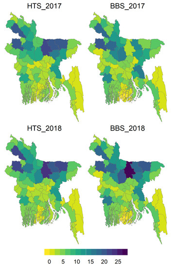In most districts, the HTS-VIs tracked relatively closely with BBS estimates by year. Figure 9 illustrates the HTS-VIs estimates compared to BBS by district for 2017 and 2018 (see Figure S2 in Supplementary Information for other years). In 2018, the district results were particularly close between BBS and HTS-VIs and the regional pattern of rice-growing areas during the dry season were consistent with a priori knowledge. The northern and central regions are the boro rice belt, while the southern areas are less consistently planted to rice for a host of environmental reasons, and the northeastern areas often wait to plant aus summer-season rice. The 2017 maps show a sharp divergence in BBS and HTS-VIs area estimates in Sylhet and Mymensingh, specifically, while other regional estimates remain similar. This is likely due to the major flood events that occurred in the mid- to late-boro season in 2017 and destroyed many rice planted fields, as noted above [42].