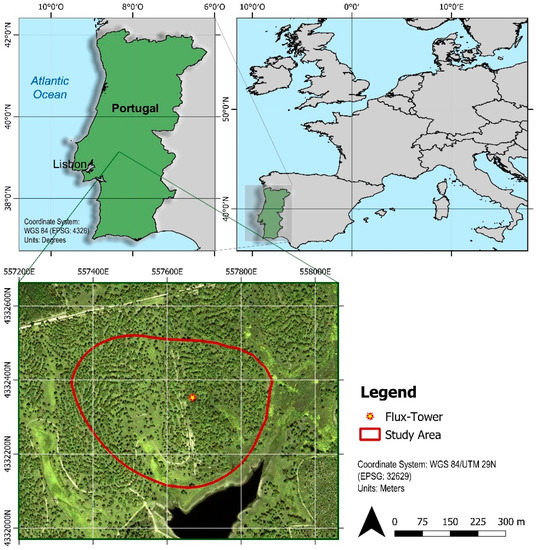 The study area is located in Central Portugal (39º08’ N; 08º19’ W) and covered by a Mediterranean cork oak woodland (Figure 1). The climate is typically Mediterranean with hot and dry summers, while most of the precipitation is concentrated between autumn and early spring (from October to April). Quercus suber is the only tree species present, and the understory is composed of a mixture of shrubs and herbaceous species [35]. The shrubby layer is composed primarily of two species, Cistus salvifolius and Ulex airensis, while the herbaceous layer is dominated by C3 species, mainly grasses and legumes. The site is a permanent research infrastructure where carbon, water, and energy are regularly measured by eddy covariance [36]. The study area is delimited by the 70% isoline of the flux tower footprint—an estimate of the extent and position of the surface contributing to the fluxes [37].