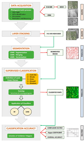 This work was conducted in the framework of a wider project aiming to derive a methodology for monitoring the gross primary productivity (GPP) of Mediterranean cork oak (Quercus suber L.) woodland by integrating spectral data and biophysical modeling. The spatial partition of the ecosystem into different coexisting vegetation layers (trees, shrubs, and grass), which is the task encompassed by this study, is essential to the fulfillment of the objective of the overarching project. The main objective of this work was to develop a supervised classification procedure of the three vegetation layers in a Mediterranean cork oak woodland by applying a GEOBIA workflow to VHR UAV imagery. In order to optimize the procedure, two different algorithms were compared: support vector machine (SVM) and random forest (RF). In addition, data from two contrasting surveying periods—spring and summer—were also compared in order to assess the effect of the composition of different layers (i.e., no living grass in the summer period) on the classification accuracy. In order to increase the processing quality, we tested a methodology based on the combination of spectral and semantic information to improve the classification procedure through the combined use of three informative layers: R-G-NIR mosaics, NDVI (normalized difference vegetation index), and DSM (digital surface model).